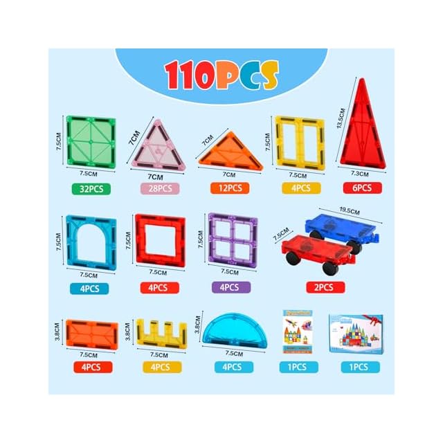 【マグネットブロック110PCSの内容物】:四角形×32 三角形×28 二等辺三角×12 長三角×6 四角(田形 )×4 四角(窓)×4 四角(扉)×4 四角(口形 )×4 長方形×4 柵×4 半円×4 タイヤパーツ×2 収納箱×1 専用ガイドブック×1