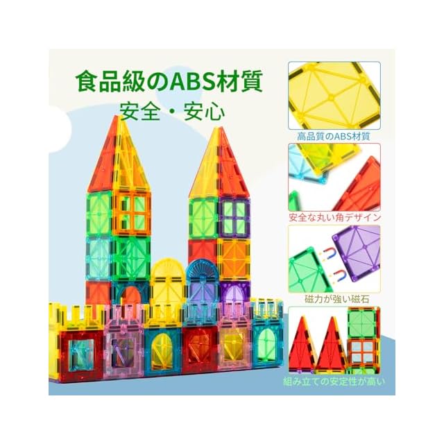 【日本食品検査済み・安全・安心・】:本商品は世界水準の日本食品検査をクリア(世界でも厳しいと言われる日本の食品安全基準)。また欧米の玩具認証EN-71、ASTMも認定済みマグネット おもちゃ! 肝心なブロックは高品質食品級のABS素材+で作られており、プラスチック各辺の中央には強磁性のマグネットが内蔵されています。長時間経っても、磁力が弱くなりなく、有害物も発散しない知育おもちゃ マグネット ブロックです。