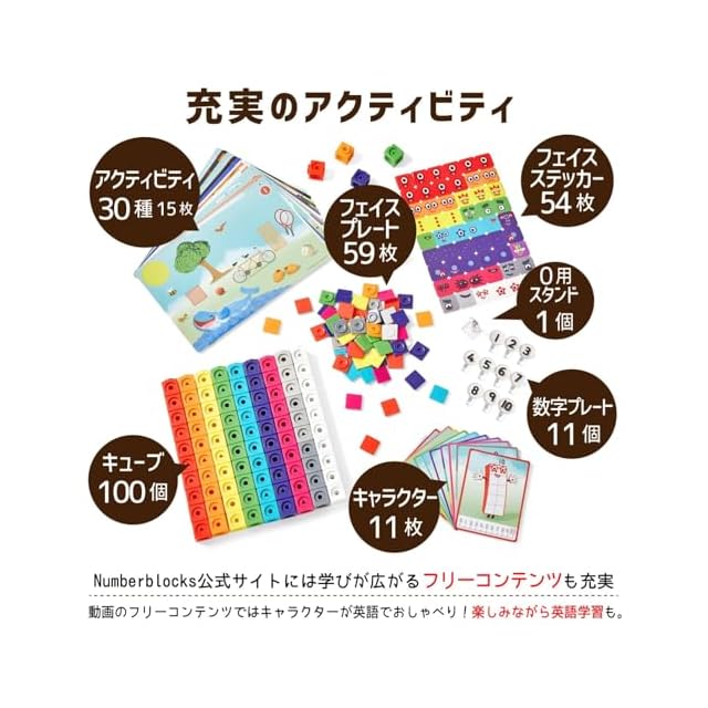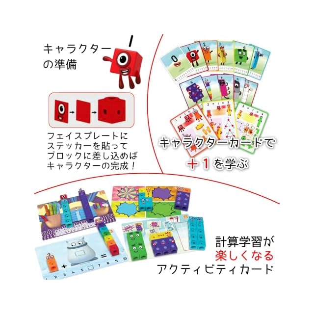 付属のアクティビティカード (両面印刷) でさまざまな数の問題にチャレンジ!1問ずつクリアしていくことによって論理的思考力や問題解決力を高めることができます。色鮮やかなキューブに付属のステッカーを貼るとナンバーブロックス (Numberblocks) の世界へ!
