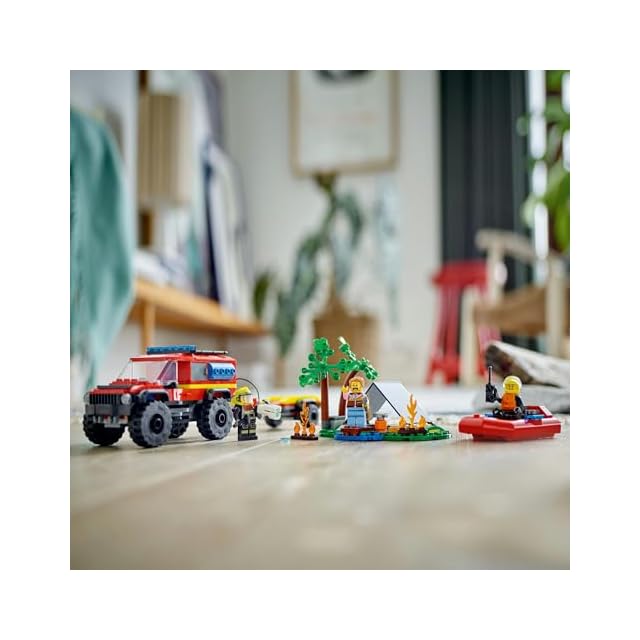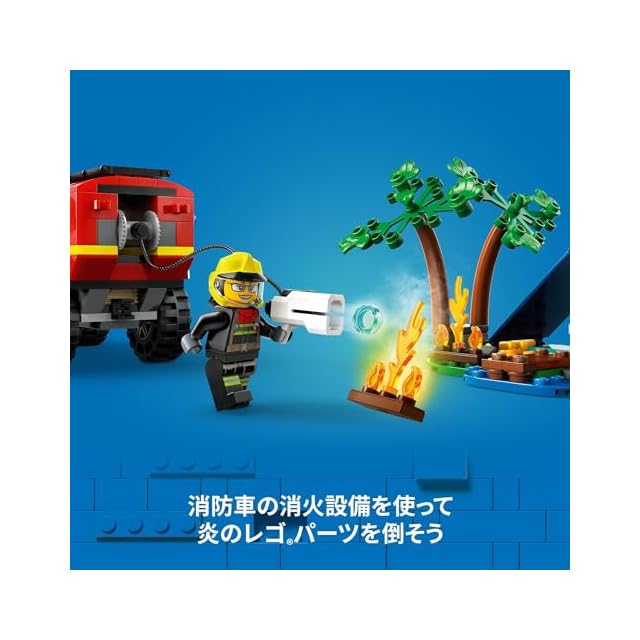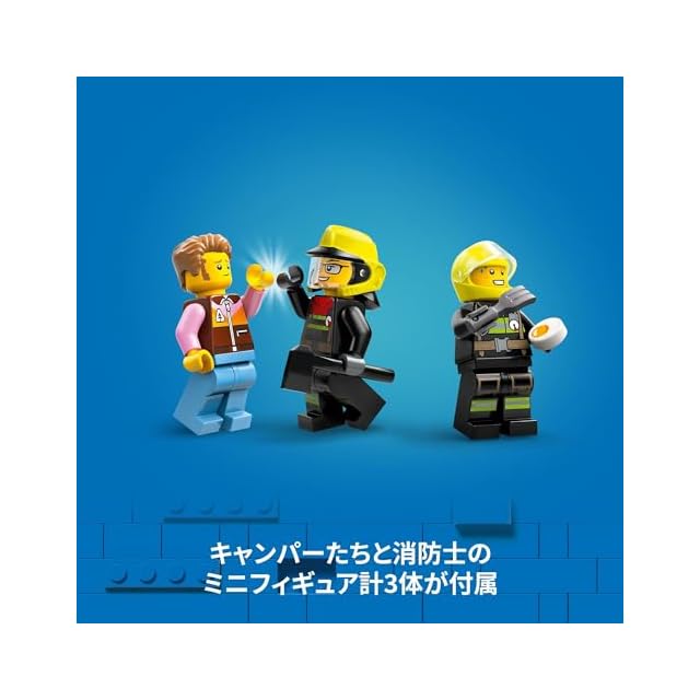 セットの内容 – 4WD消防トラック、トレーラー、レスキューボート、テント、キャンプファイヤー付きのキャンプシーンの組み立てに必要なパーツと、キャンパー1体・消防士2体のミニフィギュア