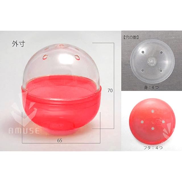 誤飲防止のために、空気穴が空いています。 穴数8~9個 身4個、フタ4~5個 ※異なる穴の数が混ざっている場合があります。 サイズ:外径直径約65mm、高さ約70mm/内径約60.5mm×高さ約68mm) ※外径は、カプセルの厚みを含むサイズです。 素材:PS(透明)、PP(カラー)