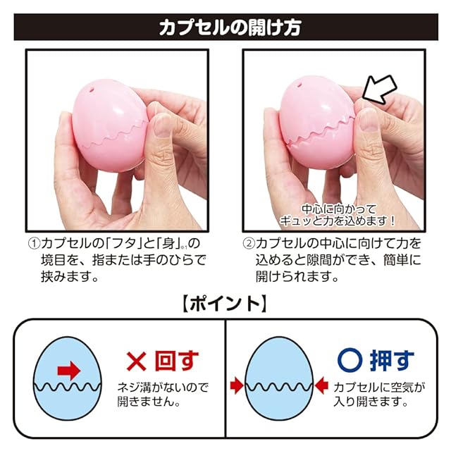 たまごカプセル素材:PP(ポリプロピレン) ・誤飲防止のための空気穴有り:(合計3~9個) /身:1~5個/フタ:2~4個 ※穴の数が異なる種類が混在している場合があります。 サイズ:外径高さ約58mm×幅約49mm,内径高さ約53mm×幅約44mm