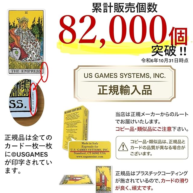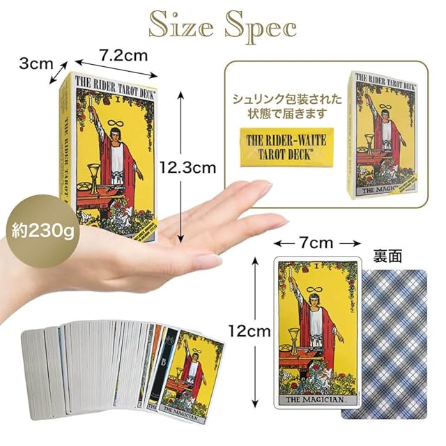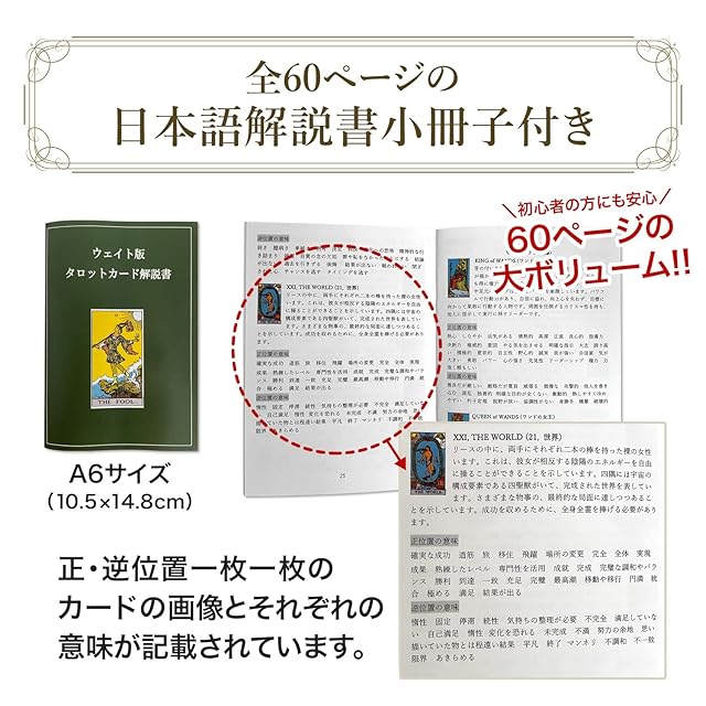 ✅本タロットカードに付いている英文説明書、全カードの画像と正・逆位置の意味も載っている日本語説明書小冊子全60ページも付いています。主要スプレッドも10通り記載されていて、初めての方もすぐにタロットリーディングが始められます。