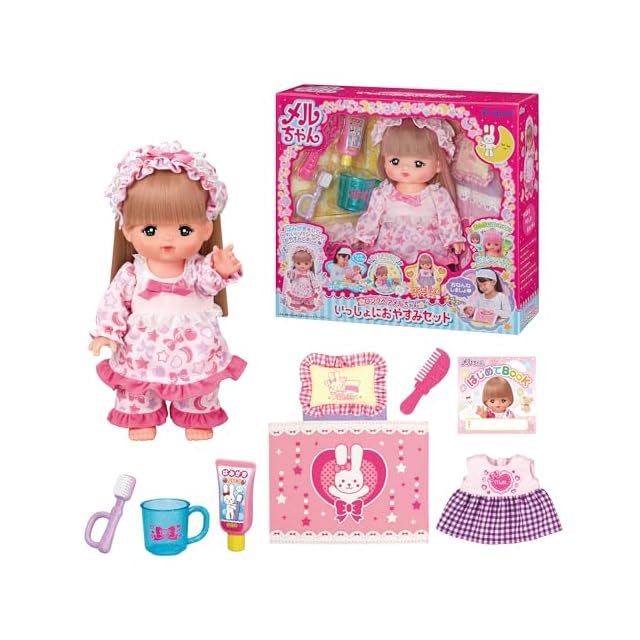 セット内容:ロングヘアメルちゃん(パンツつき)、パジャマ上下、ヘッドドレス、ワンピース、まくら、かけぶとん、しきふとん、ハブラシ、はみがきこ、コップ、くし、ミニブック