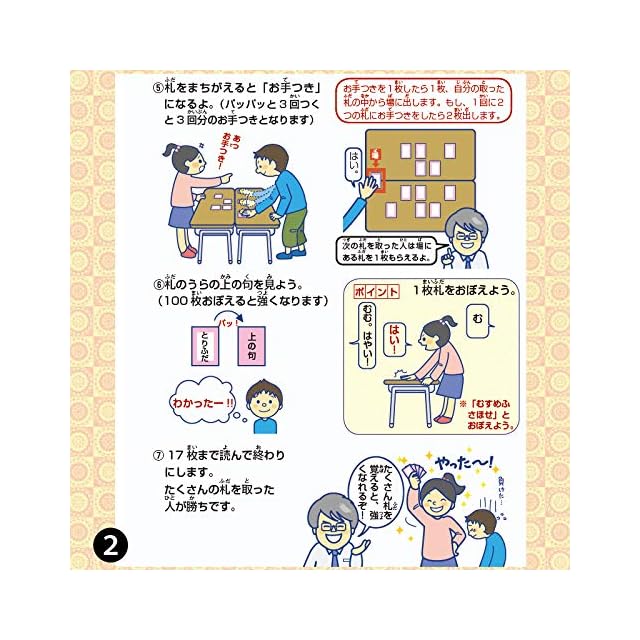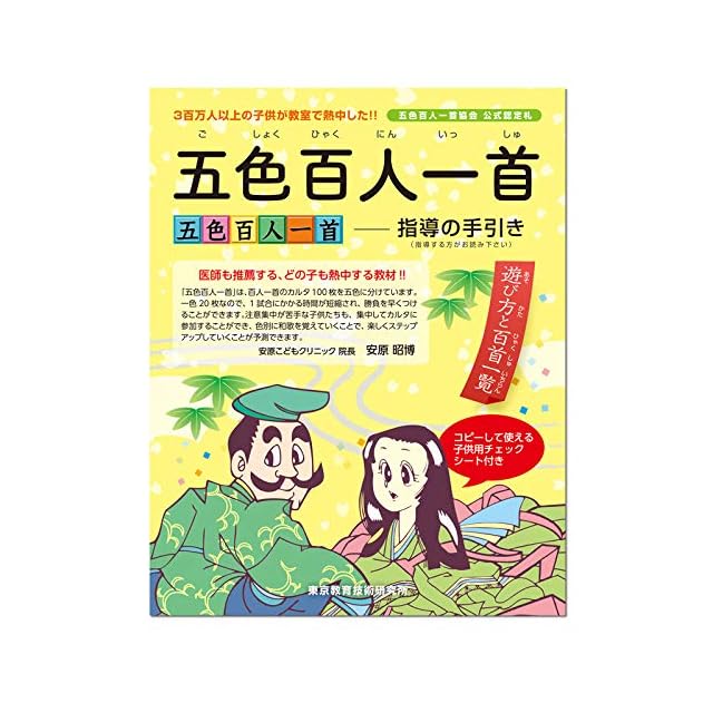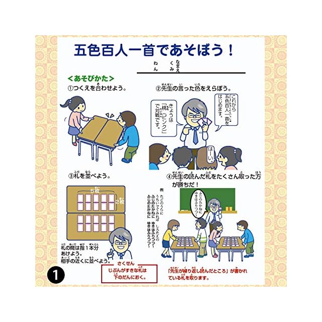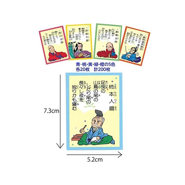 ◆五色百人一首とは<br> 「五色百人一首」は百人一首のカルタ100枚を五色に色分けした教材です。<br> 札が20枚のため一試合約3分間で決着がつきます。<br> 子どもたちは「五色百人一首」に熱中し、楽しみながら百人一首を覚えることができます。<br> 全日本かるた協会公式認定札<br> ◆本商品は、五色百人一首大会の公式認定札です。<br> 五色百人一首大会は、湯島聖堂、大宰府天満宮、鎌倉建長寺、出雲大社、善光寺などを始めとして全国各地で開かれています。<br> 詳しくは五色百人一首大会で検索!