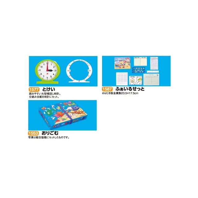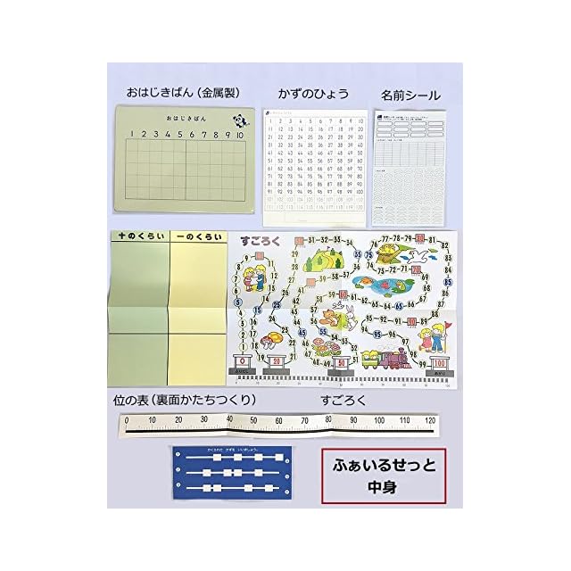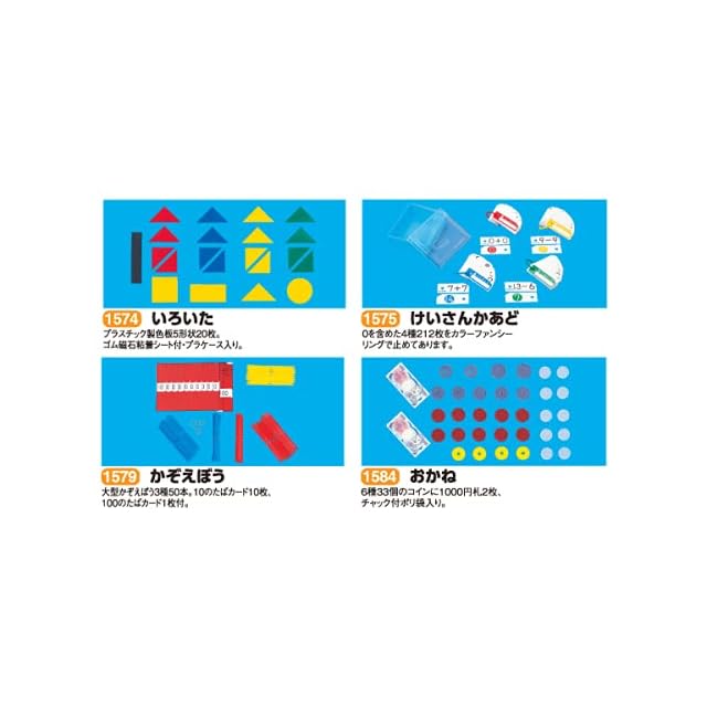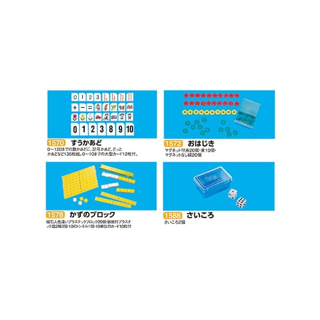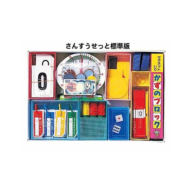 <内用品> <BR>【すうかあど】 <BR> (0-120までの数カードに、記号カード、ドットカードなど135枚組 <BR> 0-10までの大型カード12枚付) <BR>【おはじき】 <BR> (マグネット付赤20個・黄10個・マグネットなし緑20個) <BR>【かずのブロック】 <BR> (磁石入色違いプラスチックブロック20個・鉄板付プラスチック皿2種3個・10のトンネル1個・10単位のカード10枚付) <BR>【さいころ】 <BR> (さいころ2個) <BR>【いろいた】 <BR> (プラスチック製色板5形状20枚 <BR> ゴム磁石粘着シート付・プラケース入り) <BR>【けいさんかあど】 <BR> (0を含めた4種212枚をカラーファンシーリングで止めてあります) <BR>【かぞえぼう】 <BR> (大型かぞえぼう3種50本 <BR> 10のたばカード10枚、100のたばカード1枚付) <BR>【おかね】 <BR> (6種33個のコインに1000円札2枚、チャック付ポリ袋入り) <BR>【とけい】 <BR> (読みやすい大型横回し時計、分読み台紙を時計にセット) <BR>【ふぁいるせっと】 <BR>【おりごむ】 <BR>【標準版箱】