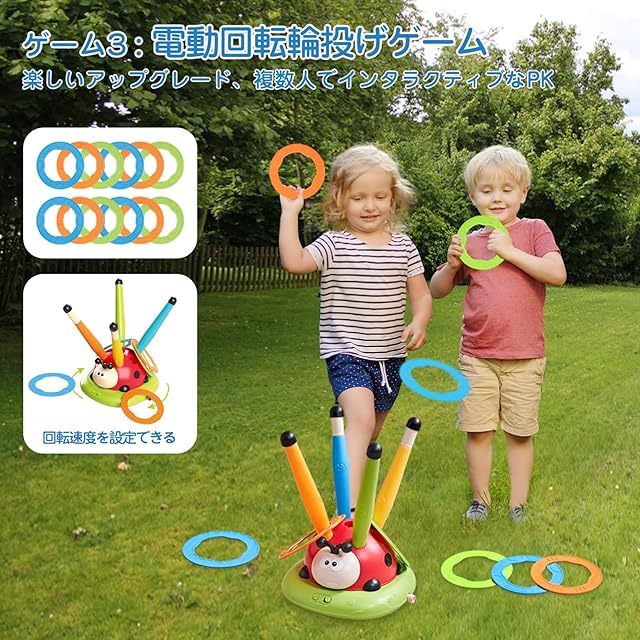 【ゲーム 3: 回転輪投げゲーム】てんとう虫のおもちゃが音楽に合わせて回転するので、適切な速度を設定して輪を投げ始めるだけです。イベントやパーティーなどのミニゲームやレクリエーションにぴったりの商品です。老若男女問わず遊べるゲームで、ルールも自由に考えられる商品になっています。