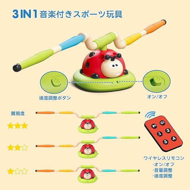 【3 in 1 ミュージカル テントウムシ おもちゃ】お子様は、てんとう虫のおもちゃを使って 3 つの異なるスポーツ ゲームを楽しむことができます。ゲーム 1: 回転ポールホッピングゲーム。ゲーム 2: 子供用玩具用ロケットランチャー。ゲーム 3: 電動回転輪投げゲーム。このスポーツ玩具は組み立てが簡単で、工具は必要ありません。単三電池 3 本が必要です (電池は付属していません)。