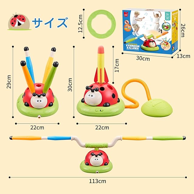 お子様は、てんとう虫のおもちゃを使って 3 つの異なるスポーツ ゲームを楽しむことができます。ゲーム 1: 回転ポールホッピングゲーム。ゲーム 2: 子供用玩具用ロケットランチャー。ゲーム 3: 電動回転輪投げゲーム。このスポーツ玩具は組み立てが簡単で、工具は必要ありません。単三電池 3 本が必要です (電池は付属していません)。