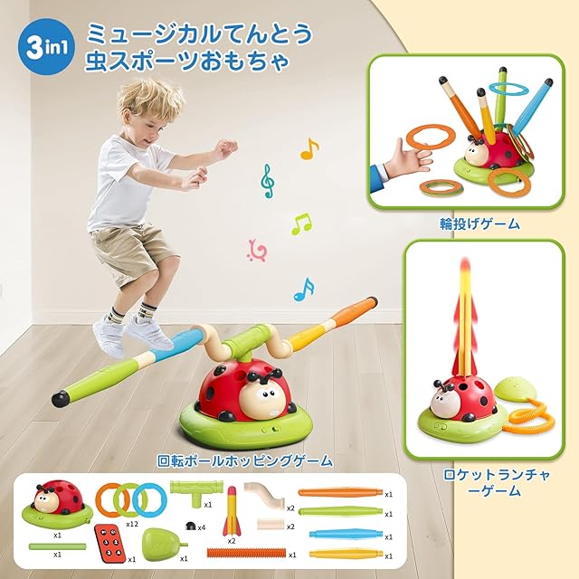 商品名:MAVEKID 3 In 1 電動縄跳び 子供 幼児 キャンプ 遊び ロケットランチャー 輪投げ おもちゃ 輪投げセット てんとう虫 玩具 音楽付き 外遊びグッズ 室内 運動 公園遊びグッズ ファミリースポーツ ゲーム 男の子 おもちゃ 人気 小学生 3歳 4歳 5歳 6歳 7歳 8歳 男の子 女の子 誕生日プレゼント( リモコン付き)