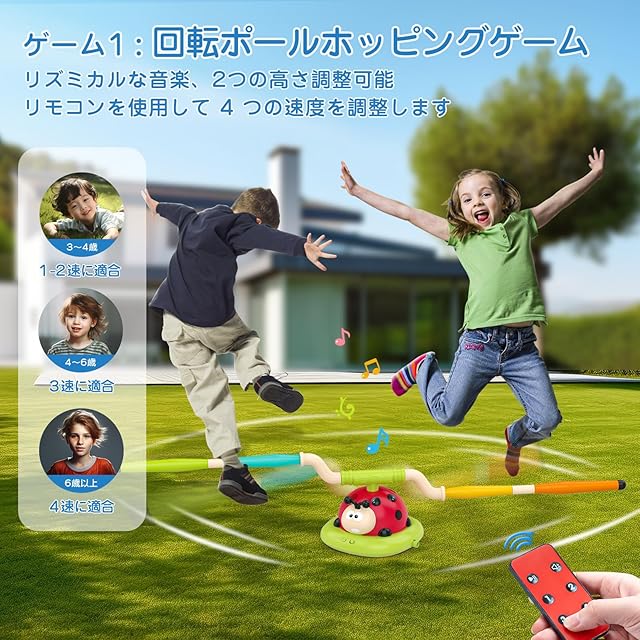 【ゲーム 1: 回転ポールホッピングゲーム】スポーツおもちゃの電源を入れると、音楽に合わせてポールが回転し、子供たちがジャンプしたりポールをまたぐことができます。4つの速度はさまざまな年齢の子供に適しており、リモコンで速度を変更できます。スピード 1 ~ 2 は 3 ~ 4 歳のお子様に適しており、スピード 3 は 4 ~ 6 歳のお子様に適しており、スピード 4 は 6 歳以上のお子様に適しています。