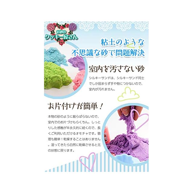 砂遊びのような感覚なのに、ギュッと握ると粘土の感覚!シルキーサンドは室内で砂遊びができ、お部屋が汚れない不思議な砂。砂遊びで気になる衛生面や、体中砂だらけになってしまうという心配はいりません。 シルキーサンド同士でしか固まらず手や物につかないので、室内が汚れません。 お片付けが簡単! しっとりした感触が半永久的に続くので、長くご利用いただけるオモチャです。管理も簡単!乾燥することはありません。 乾燥してきたら付属のビニール袋に入れ、一晩放置すると元の状態に戻ります。(絶対に水は混ぜないでください) 感覚遊びで子供の能力をUP! 子どもたちは、いろいろなものに触れ、そして感じて感触を体感します。そうやって感覚を発達させていくのです。そして感覚遊びを沢山した子供は好奇心や探究心が盛んになる傾向にあると言われています。 ■集中力アップ 作品を作り上げたいという気持ちから自ずと集中してしまうので、集中力が養われています。 ■手先の器用さ 全体を固める時は手のひら、細かい部分の装飾は指先、と手を使って作りあげていく為、遊びながら手の使い方を習得していきます。 ■想像力&創造力が豊かになる 多様に変化するものから様々な形を作り出すことは、想像力や立体認識能力が高まります。 自分で何かを作ろうと思う気持ちが想像力を掻き立て、創造力を育てます。