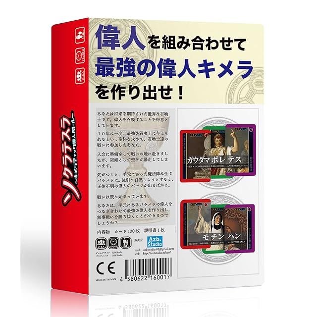 「ソクラテスラ」は様々な偉人を組み合わせ、最強の偉人を作り出して戦わせるキメラ偉人カードゲームです。