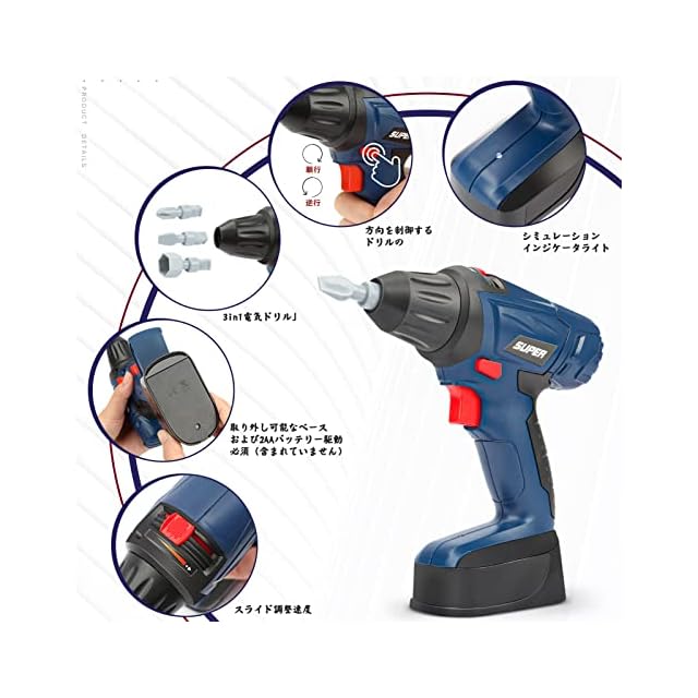 【子供 おもちゃ 工具 収納】電子玩具ドリル(2 * AA電池が必要、含まれていません)は、たちにとってより魅力的な、リアルなサウンドとアクションとライトを実現します。さまざまな機能のための3つの交換可能なドリルビットを装備。