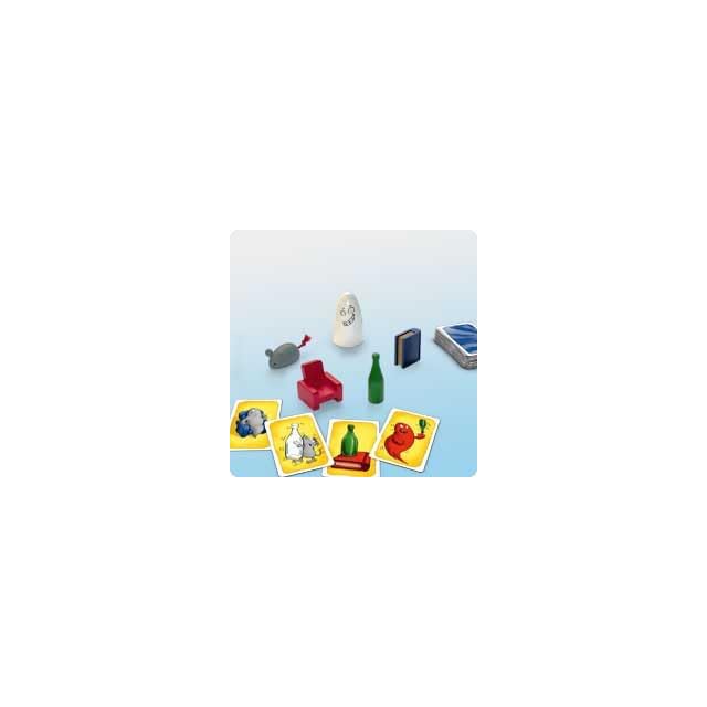 当店限定「収納X形ゴムバンド」付き! 安心のメーカー正規品の日本語解説書付きの商品となります。 「赤いイス」、「白いおばけ」、「緑のビン」、「青い本」、「灰色のネズミ」のオブジェを、 カルタのように早い者勝ちで取るゲーム。 誰かが札を読み上げるのではなく、「お題カード」をめくって、絵に描かれているものと一致するものを取ります。 (例えば、カードの絵に白いおばけがあればそれを取るだけです。ですが、絵札の中には完全に一致するものが無い場合もあり、(例:白いネズミと青いビンなど)その場合はまったく一致しないもの(赤いイス)を取ります。これがあるために大人でも混乱するようになっていて盛り上がります。) 観察力と瞬発力、スピードが命です。 子どもから大人までみんなで盛り上がる事間違い無しのボードゲームです。