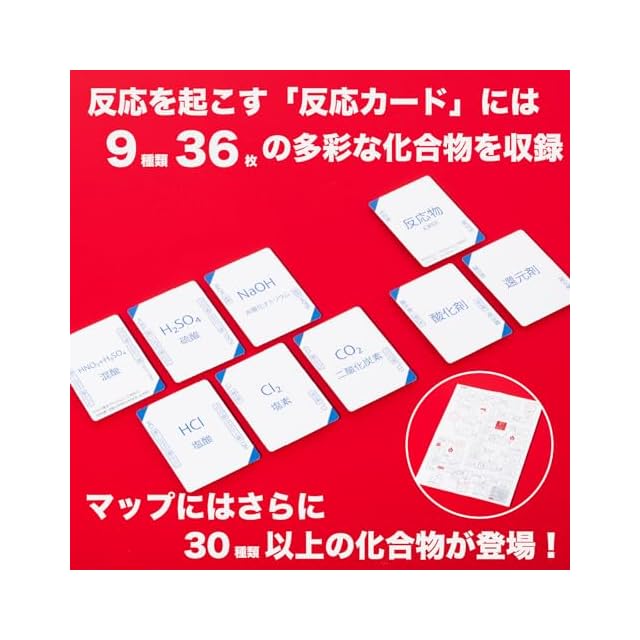 【内容物】反応物カード36枚、チップ12枚、マップ1枚、説明書1枚、サマリーカード4枚、初心者おすすめルールカード1枚