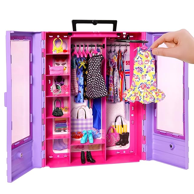 【内容】スタイリッシュなクローゼットは15種類以上のファッションとアクセサリーがセットになっていて、様々なコーディネートが楽しめます。いくつもの収納スペースがあり、衣類ラックは折りたたんで収納することもできます。お家で遊ぶのはもちろん、お出かけにも簡単に持っていけます。ハンガー6本、ファッション3点、ネックレス2点、財布2点、靴3点がセットに含まれます。