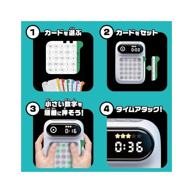 ポチっと脳トレ!老若男女が遊び感覚で脳を鍛えられる脳トレトイ!いつでもどこでも楽しく集中力や注意力、記憶力を鍛えられるコンパクトサイズゲーム!視線をボードの中央に集中させることで、周辺視野を広げるトレーニングにも!<br>●ボタンの音と感触がたまらない!何度もトライしたくなる!ミスなく全てのボタンを押せた時の達成感がすごい!●3つのモードで飽きさせない!遊び方は超簡単!<br>①早押しモード:カードを挿入してスタートボタンを押し、数字が小さいものから順にボタンを押す!早さを競うタイムアタック!②順番メモリーモード:スタートボタンを押し、点滅するライトの順番と位置を記憶して再現する。3回間違えると失敗!③図形メモリーモード:スタートボタンを押し、ボタンが点灯した全ての位置を記憶して再現する。3回間違えると失敗!