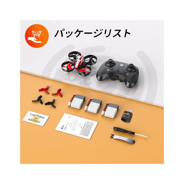 【パッケージリスト】本体*1;送信機*1;バッテリー*3;予備プロペラ*4;充電器*1 ;ドライバー*1;プロペラ用具*1;日本語取扱説明書*1