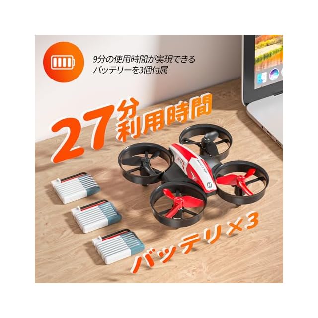 【フライト時間合計27分】バッテリー3個付き、合わせて飛行時間27分となります。ミニドローンなので、思う存分に楽しめます。