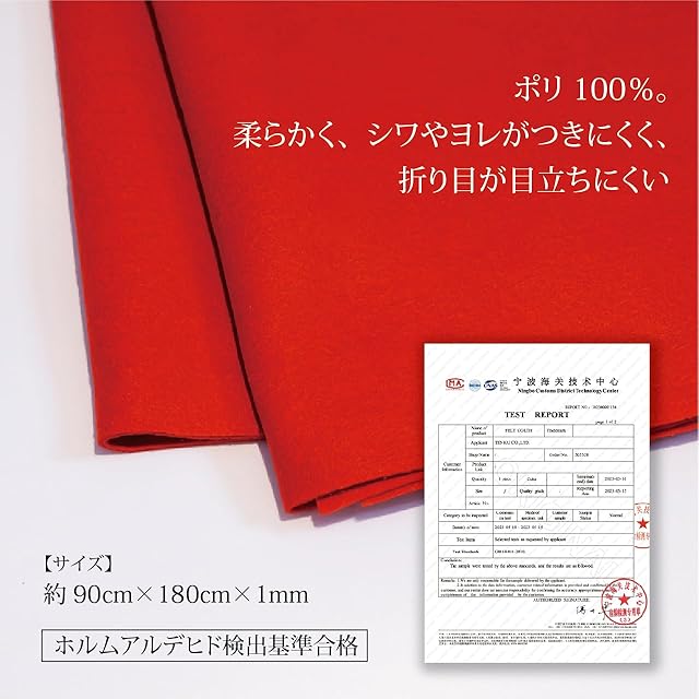 【柔らかく、折り目が目立ちにくい】 高級 毛氈 毛せん 赤 緋毛氈 【サイズ】約90cm×180cm×1mm 【素材】ポリエステル100% 【ドライクリーニングで洗濯可能!】ドライクリーニングで洗うことができます。 【シワやヨレがつきにくい】ポリ100%なので、シワやヨレがつきにくい。触り心地もよく柔らかいです。 【用途】結納 ひな祭り 結婚式 和装飾 撮影 敷物 カーペット 書道 高座 舞台 などにご使用ください。 【注意】洗濯は水洗いをさけ、必ずドライクリーニングしてください。プレスはあて布をし、水・霧をかけずにアイロンをおかけください。 加工ロットにより色あいに多少のブレが生じることがあります。この素材は現在の染色技術では摩擦、水ぬれ等による多少の脱色はさけられませんのであらかじめご了承願います。 織物と違い切口のホツレが出にくいので、取り扱いが簡単です。