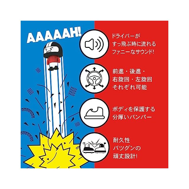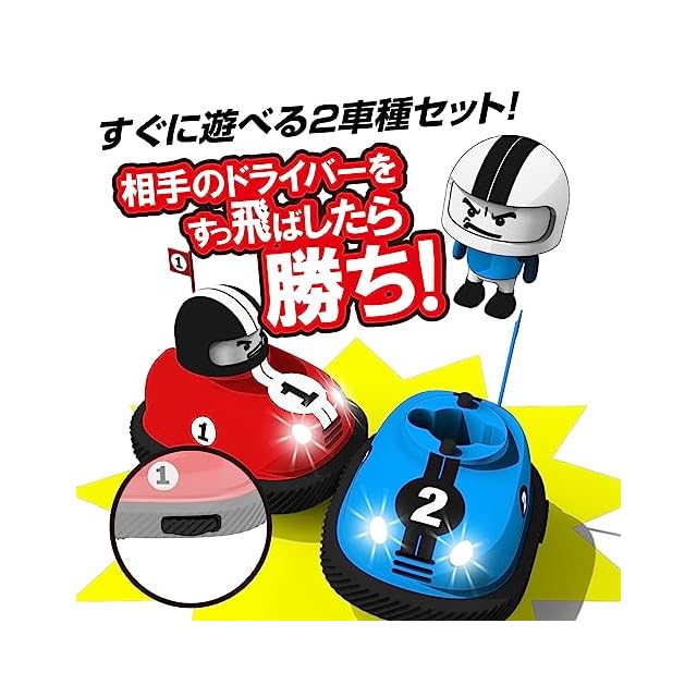 ルールは簡単!カートを操縦して、相手の側面にあるパンパ―を狙い、豪快にぶつけ合うアクションR/C!上手くバンパーにぶつかると、相手のドライバーが吹っ飛ぶ!カートをぶつけてガチンコバトル!!操縦は左右2つのスティックをスライドするだけなので簡単!R/Cがはじめてでも楽しめます。本体と送信機は耐久性バツグンの頑丈設計!ぶつかっても壊れにくい!!2台の本体と送信機がセットなので、友達同士やご家族で遊ぶことが出来ます!