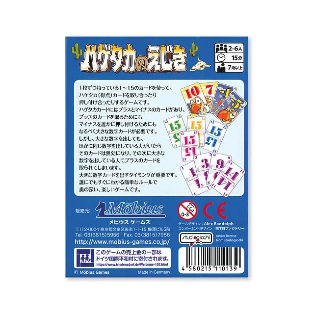 ボードゲーム 商品解説 ロングセーラーカードゲームです。1988年のゲーム大賞にノミネートされています。 各プレーヤーは、1から15までのカードを1枚ずつ持っています。-5~+10のハゲタカカードをよく混ぜて、テーブルの中央に置きます。 ハゲタカカードの山の一番上を表にし、各プレーヤーは手札から1枚選んで自分の前に出します。すべてのプレーヤーが出したら一斉にそれを表にします。 ハゲタカカードは得点カードです。ハゲタカカードがプラスの場合は一番大きな数字を出している人が取れます。 ただし、同じ数字を出している人がいる場合には、それらの人は取れません。その次に大きな数字を出している人が取れます。 つまり「単独で一番大きな数字」を出している人がとります。 ハゲタカカードがマイナスの場合は、一番小さなカードを出している人がとらなければなりません。 ただしこの場合も、同じ数字を出している人がいれば取る必要はありません。「単独で一番小さな数字」を出している人が取らなければなりません。 たったこれだけのルールですが、波長が合いすぎる人がいると、なかなかハゲタカカードが取れません。 他の人と違うカードを出そうとすればするほど、同じカードを出してしまうのです。 ゲーム概略 プレイ人数:2~3人 プレイ時間:約20分 対象年齢:8歳以上 デザイナー:アレックス・ランドルフ(Alex Randolph) <内容物> 数字カード 90枚 得点カード 15枚