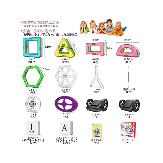 ✅『108pcs、安全・安心』マグネットブロックはABS素材で、大きいサイズですので、安心・安全な知育玩具です。⭐⭐⭐商品内容:108pcs---パッケージに含まれるもの:四角形×24pcs、三角形×22pcs、長三角形×4pcs、半円×4pcs、六角形×2pcs、白六角形×2pcs、レッグ×2pcs、連続ロード×1pcs、ボルト×2pcs、ベース×1pcs、ホイール1×1pcs、ホイール2×1pcs、数学カード×16pcs(非磁性)、アルファベットカード×26pcs(非磁性)、アイデアガイド×1pcs ⭐⭐ご注意:ブロックパーツはランダム配色!⭐ピースサイズは図表のようにご覧ください。