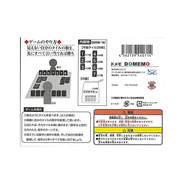 タイトル:ドメモ(DOMEMO)木製タイル版 メーカー:クロノス 作者:アレックス・ランドルフ プレイ人数:2-5人 プレイ時間:10分 対象年齢:6才以上 日本語ルール説明書ついています。 ジャンル:かけひき・論理的思考 YouTubeでルール紹介動画をご覧いただけます。QRコードを 読み込んでいただくか、商品名の「ドメモ」で検索してください。 狙うはノーミスの勝ち。秘密の保持ができ、このゲームが 楽しめるようになったら大人の仲間入りです。