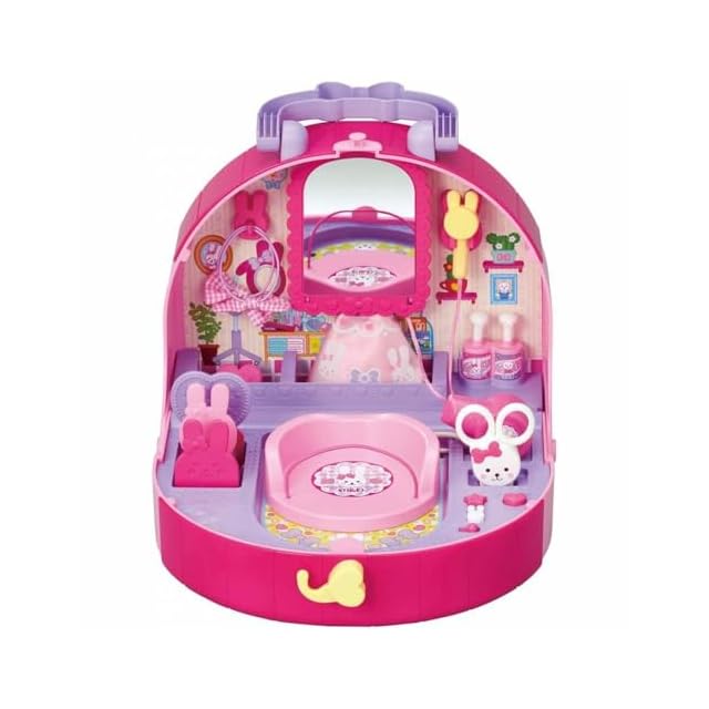 うさぎさんデザインがいっぱいのメルちゃんのびようしつセット。ボタンを押したりハサミを開閉すると、シャワーやドライヤーの音が鳴ったり店員さんの声が流れたりと、楽しい機能がいっぱいです。小物の種類も豊富で、びようしさんになりきって楽しく遊ぼう。単3電池×2本使用(別売)