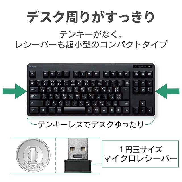 1円玉サイズのマイクロレシーバーを採用しており、パソコンのUSBポートに挿すだけで、すぐに使用することができる無線接続タイプです。