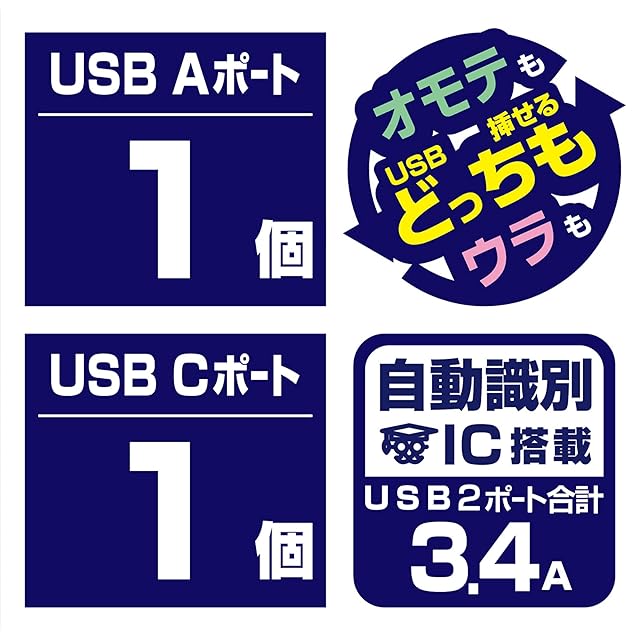 リバーシブルUSB-Aポートで表も裏もどっちも充電。