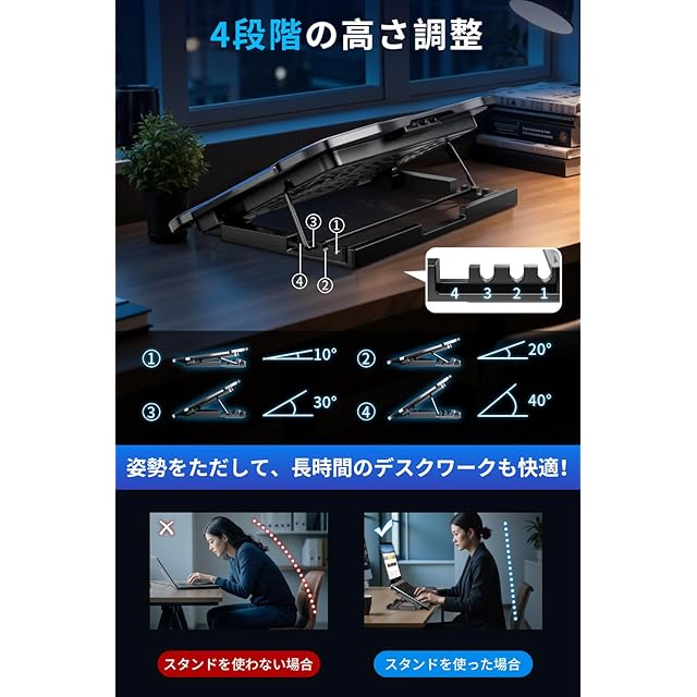 【人間工学に基づいたデザイン】4段階高度や角度調整可能多くの人の身長に適して、長時間のテレワークも首や肩に負担掛かりません。デスクワーク姿勢を矯正でき。ノートパソコンの角度を0°~40°まで、目線が上がると背筋も伸ばしやすくなります 。