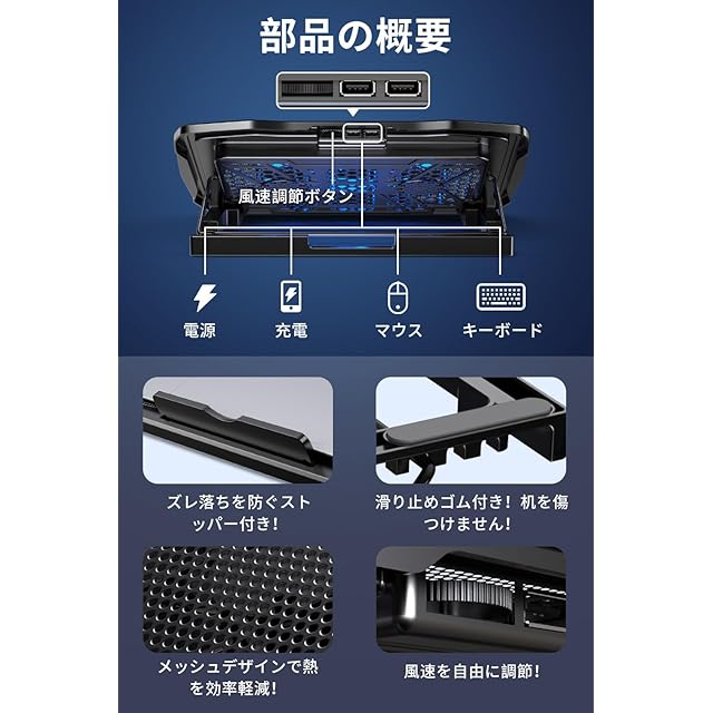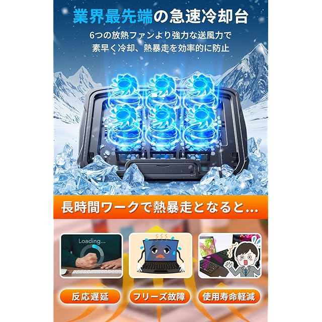 【冷却ファン6つ付き】 長さが7cmの強力冷却ファンを6つ搭載し、ファン回転数は2500±10%RPMです。 ノートパソコン熱量に合わせて、冷却ファンの風量を調節できます。