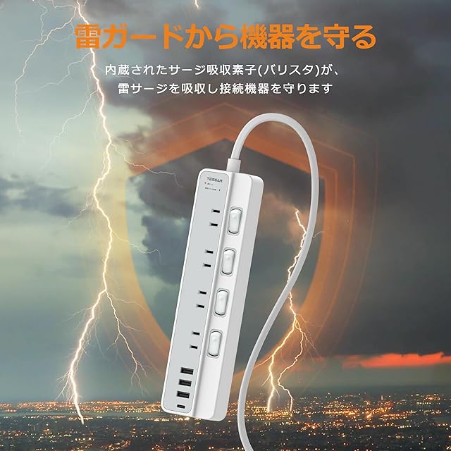 【ほこりシャッター・雷ガードタップ】このケーブルタップは雷ガード機能も装備されており、内蔵されたサージ吸収素子(バリスタ)が雷サージを吸収し、接続機器を守ります。このコンセント タップの差込口に「ほこり防止シャッター」を搭載した、未使用時の差込口へのほこりの浸入を防止する、トラッキング現象による火災やお子様のいたずらによる感電・火災の防止に役立ちます。