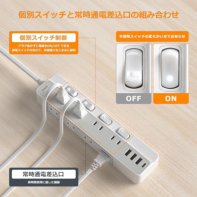 【常時通電&個別スイッチ・節電タップ】左側の 4 つの ACコンセントには常に電源が供給されて、正面の4 つのスイッチでは制御されません。この常時電源では、ルーターや見守りカメラなど、常に電源をオンにしておく必要があるデバイスを接続できます。正面の4 つのスイッチ付きコンセントは、スイッチで電源のオン/オフを制御でき、パソコン、電気ケトルなどに接続できます。このケーブルタップの柔軟な制御により、エネルギーと節電が非常に簡単になります。