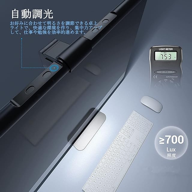 【 無段階輝度調光・三種類の照明モード・メモリー機能 】 三種類の照明モードがサーポート。昼白色6400K(明るくて仕事の効率UP)、昼光色4200K(中性的な色温度で残業に最適)、電球色3100K(柔らかい光でネトゲに最適)、使用シーンにより、明るさと色温度がお選べる。バーライト左右のタッチセンサーで明るさを自由に調節でき、異なる環境の人の明るさに対する需要に対応する。また、メモリー機能が加え、お好みの色と明るさを覚える。
