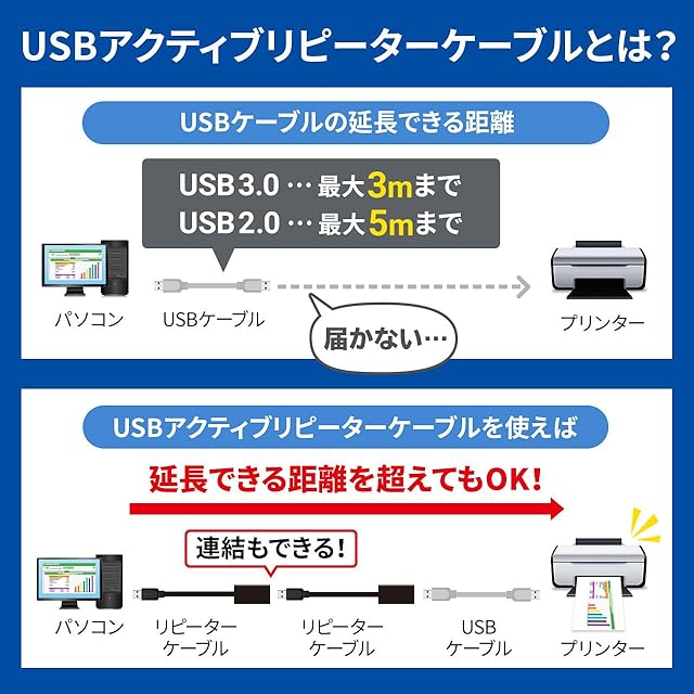 USBケーブルの規格(機器間最長ケーブル長5m)を超えて、さらに5m延長できるリピーターケーブルです。