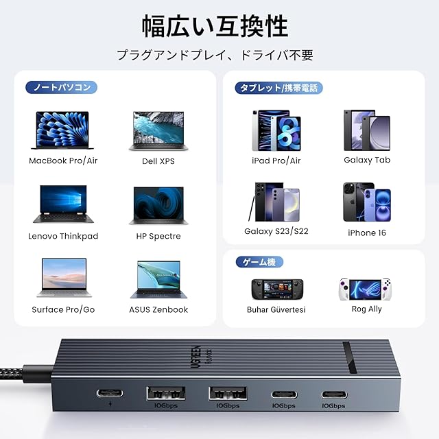 【USB 3.2 時代の幕開け】二つ USB-C データ ポートと二つ USB-A ポートを介して、最大 10 Gbps の速度でファイル、映画、写真を転送します。10Gbps とマークされた C ポートはデータ転送にのみ使用でき、ビデオ出力や充電には対応していません。