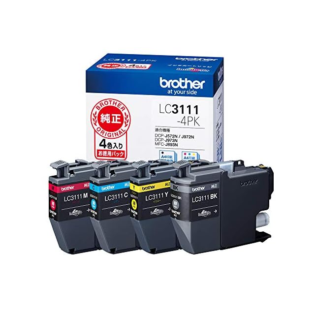 商品名:ブラザー工業 【brother純正】インクカートリッジ4色パック LC3111-4PK 対応型番:DCP-J987N、DCP-J982N、DCP-J587N、DCP-J582N、MFC-J738DN 他 黒、シアン、マゼンタ、イエロー