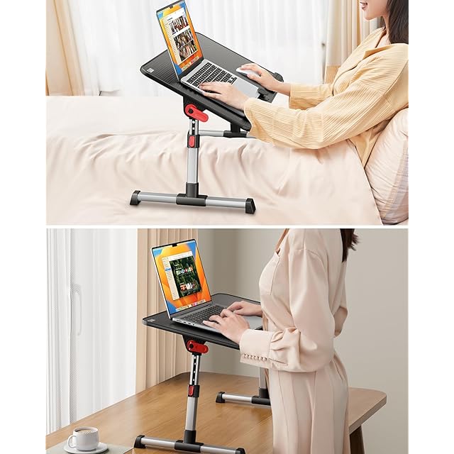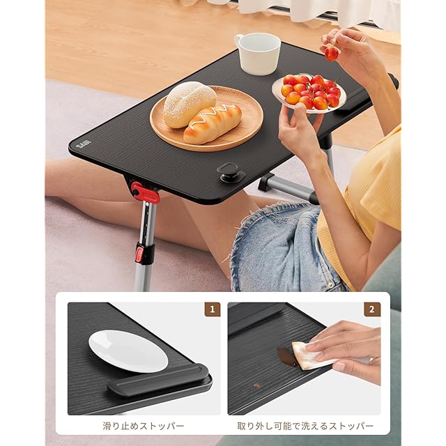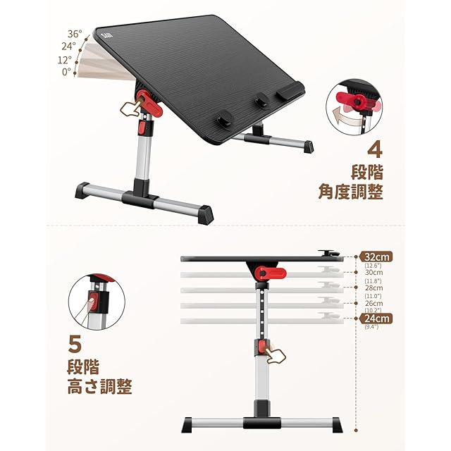 角度·高さを調節できるテーブル:高さ:5段階調整:24~32cm、角度は4段階:0~36°調整できる;天板の下広い空間がある両脚が自由に動けます。休日にノートpcで映画を見ながらベッドで過ごす時間を快適に。