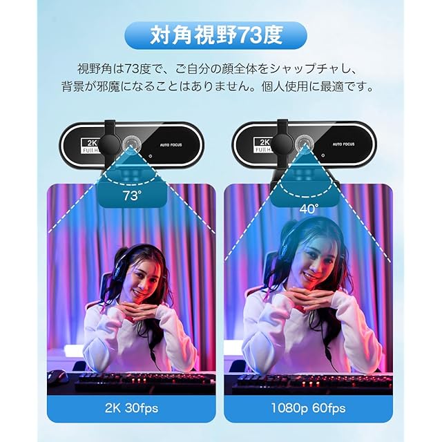 【高解像度・超広角レンズ】400万画素の2Kウェブカメラは、高い解像度と鮮やかな色を実現します。細部まで鮮明に見えるため、臨場感あふれる映像体験が可能になります。また、フレームレート30fpsで身振りも滑らかに捉え、オンライン会議で自然な映像を届けることができます。リモートワーク、ハイブリッドワークに最適なウェブカメラです。