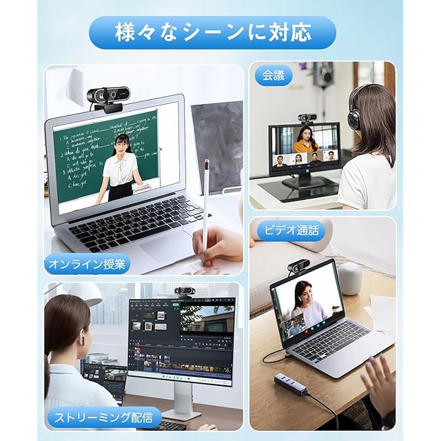 【HD光補正・フォーカスレンズ】自動光補正機能を搭載するウェブカメラ は、環境にあわせて自動的に光量バランスやホワイトバランスを調節し、照明条件に影響されることなく明るくきれいな映像を提供します。レンズがピンとを自動で合わせてくれるので,力メラや被写体の位置を調整する必要があリません。