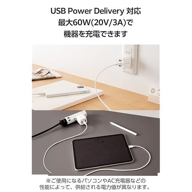 USB Power Deliveryに対応し、最大60W(20V/3A)で接続機器の充電ができます。