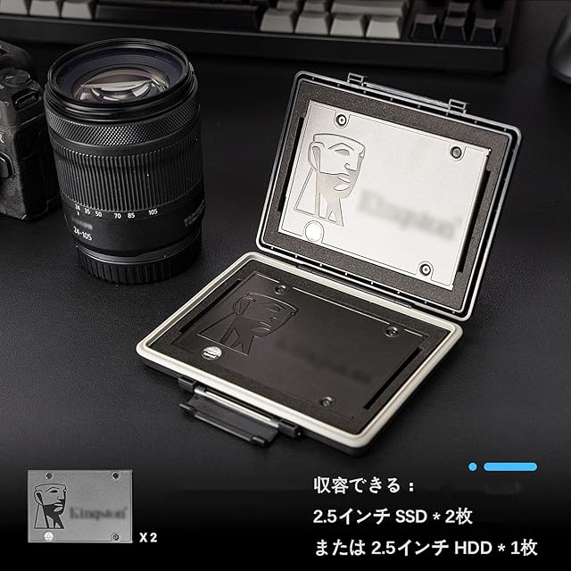 【収容できる】2.5インチ SSD * 2枚 または 2.5インチ HDD * 1枚収納可能。