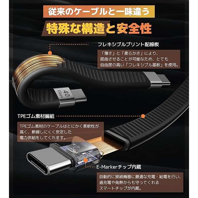 ❹【E-Mark チップ搭載】E-Mark チップの充電保護システムにより、接続された端末の入力電圧を自動検知し、最適の出力により安全且つ急速給電でき、過充電、発熱などから大切な機器を守ります。