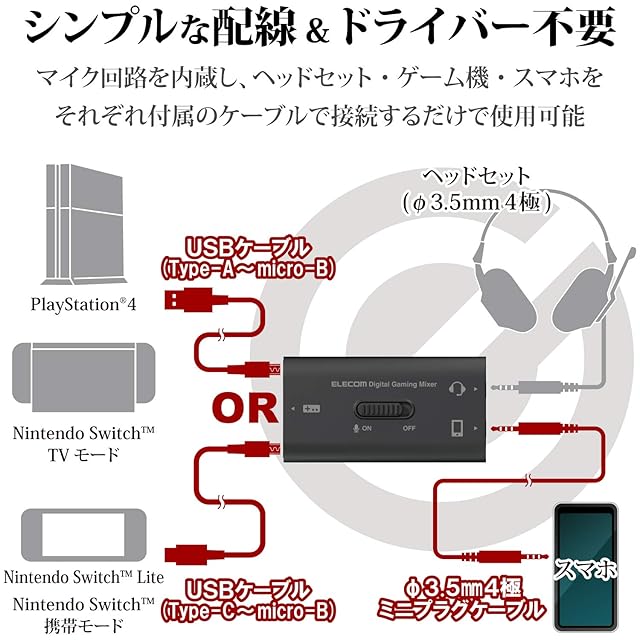 マイク回路を内蔵し、ヘッドセット、ゲーム機、スマートフォンをそれぞれ付属のケーブルで接続するだけのシンプルな配線で使用可能です。