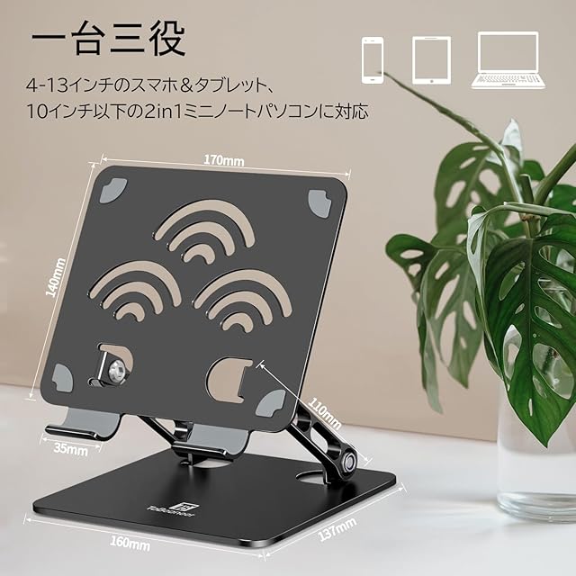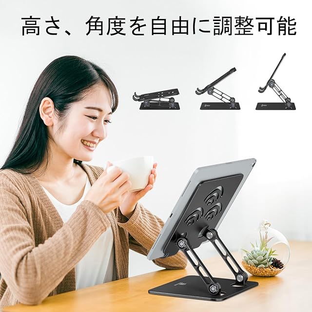 iPadスタンド タブレットスタンド 本製品はわずか348グラムで、持ち運びに便利です。4から13インチ以下のスマホやタブレット、10インチ以下の2in1ミニノートパソコンにも対応しています。オフィス、自宅、図書館など、どこでもご利用いただけます。会社員から学生まで幅広いニーズに対応し、作業効率を向上させます。オンライン会議、動画視聴、テキスト入力など、あらゆる活動に最適です。さらに、デスクやテーブルの上での整理整頓にも役立ちます。ワイヤレスキーボードやマウスと組み合わせて、より快適な作業環境を構築できます。