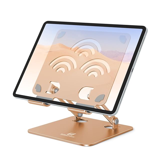 ipadスタンド - タブレット スタンド - 絵描きホルダー - ToBeoneer(ツビワ) - アイパッド 高さ角度調整可能 持ち運び便利 折りたたみ式 イラスト 置き台 卓上 アルミ製 軽量 充電stand 立て 在宅ワーク ZOOM 会議 ipad pro/mini/air/Kindleなど4-12.9インチに対応 (ゴールド, 標準版) | つむぎ屋