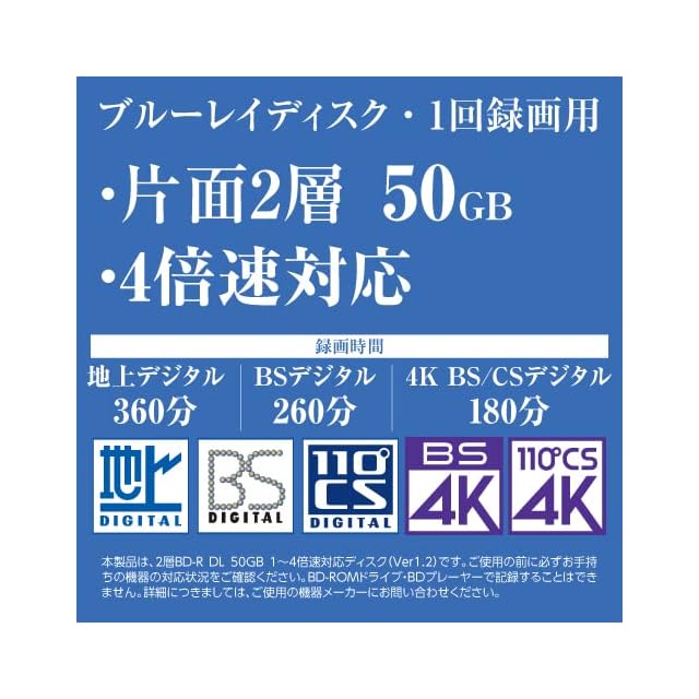 【商品詳細】・1回録画用BD-R DL 50GB 50枚 スピンドルケース入り・地上デジタル/BSデジタル/4K BS CSデジタル対応・インクジェットプリンター対応ホワイトレーベル(内径22mmまで印刷可能なワイドプリンタブル)・キズ、ほこりに強いハードコートディスク・信頼のRiTEK製